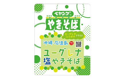 「ペヤング 沖縄・石垣島ユーグレナ塩やきそば」塩ベースのソースと栄養豊富な石垣島ユーグレナふりかけが相性抜群です。『ペヤング』シリーズの中でも、おいしさと栄養を両立させた商品です。おいしく1日推奨摂取量の半分の石垣島ユーグレナ5億個を摂取することができます。