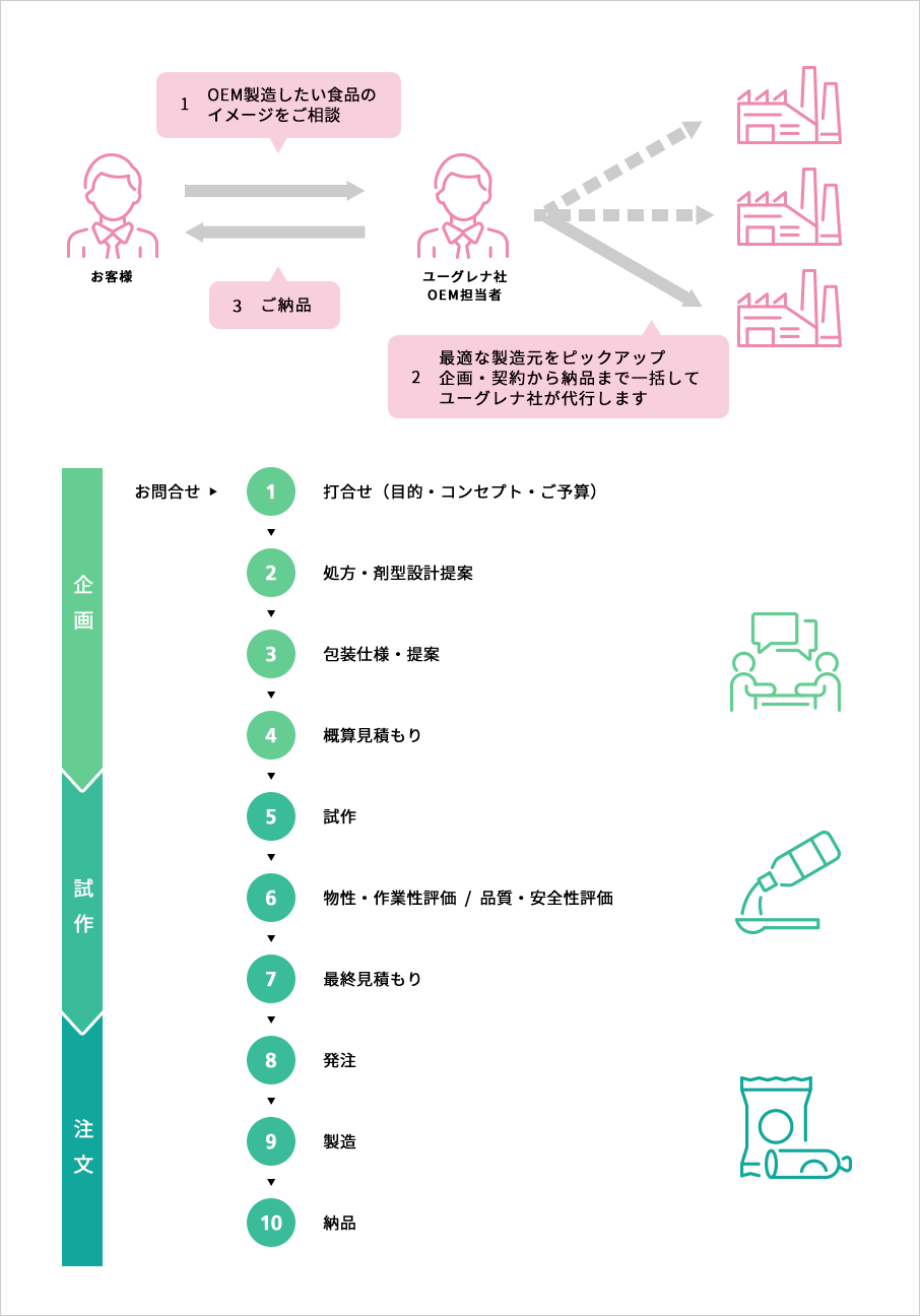 希少成分「パラミロン」を含む59種類の豊富な栄養素を持つユーグレナ社の代表素材「石垣島ユーグレナ」をはじめとした各種素材を使用して健康食品や化粧品等、お取引先さまのニーズに応じたOEM製品の企画・受託製造を行っています。