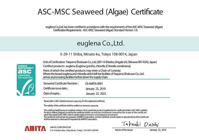 金山たちの努力が結実し、このたびユーグレナ社と八重山殖産が生産する石垣島ユーグレナおよびヤエヤマクロレラが、世界で初めて「ASC-MSC 海藻(藻類)認証」を取得した。