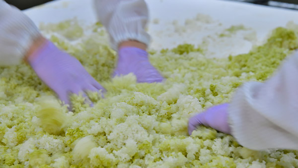 • 2.ユーグレナと種麹が蒸し米にしっかり付くよう手で混ぜ込む