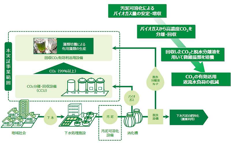 2017年2月、研究を重ねた結果、ついに下水処理の過程で回収したCO2、そして下水中の窒素とリンを用いた培養であっても、上水を用いた通常の培養のときと同じように効率的にユーグレナを増殖させられることに成功した。つまり、下水処理施設の下水・排水を活用してユーグレナを培養しても、生産量を落とすことなく、従来よりも大幅に培養コストを低減することが可能であることが実証できたのだ。さらには、下水中の窒素やリンをユーグレナの培養に利用することで、下水処理場への負荷を低減する効果も期待できることが分かった。
