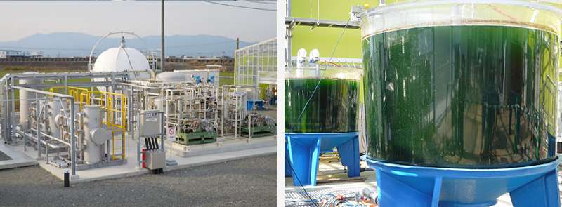 東芝のCO2分離回収装置(左)とユーグレナを培養する水槽(右)