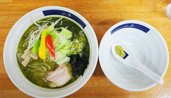「みどりラーメン」は、「山手らーめん」の特長である白濁のスープに、