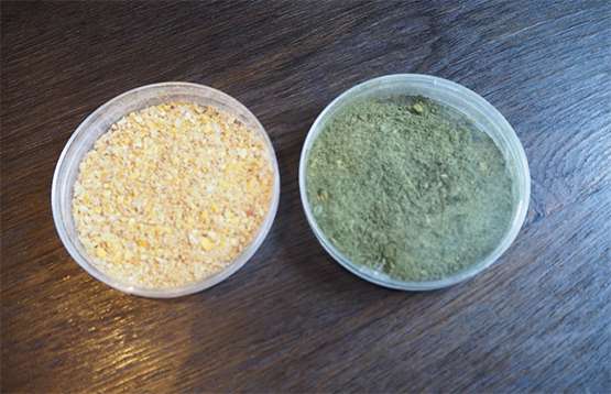 開発した飼料(左:通常の飼料、右:ユーグレナとクロレラ配合飼料)