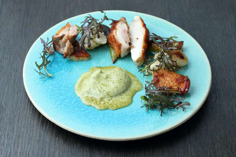 「比内地鶏と香ばしい野菜のサラダ仕立て ユーグレナと山葵のクレマ添え」