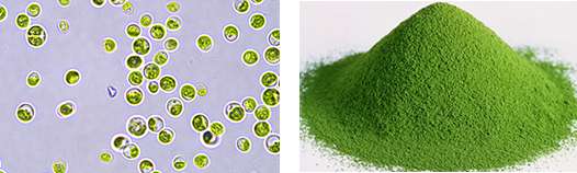~顕微鏡で見たクロレラとクロレラ粉末~