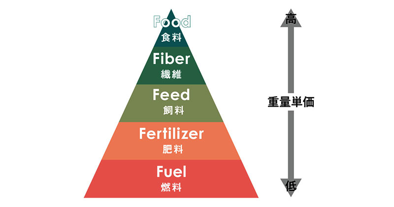 以前より、ユーグレナ社では『バイオマスの5F』という事業戦略を推進している。この戦略は、Food(食料)、Fiber(繊維)、Feed(飼料)、Fertilizer(肥料)、Fuel(燃料)といった、バイオマスの5つの用途について、重量単価の高いものから低いものへと順次事業を展開していくことで、バイオマスの生産コスト低減とバイオマスの利用可能性の拡大を推進するというものだ。