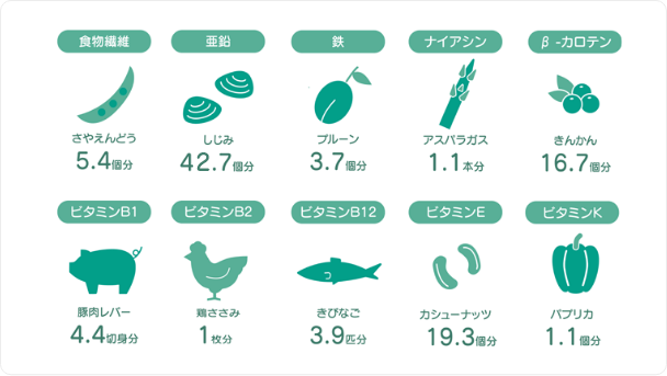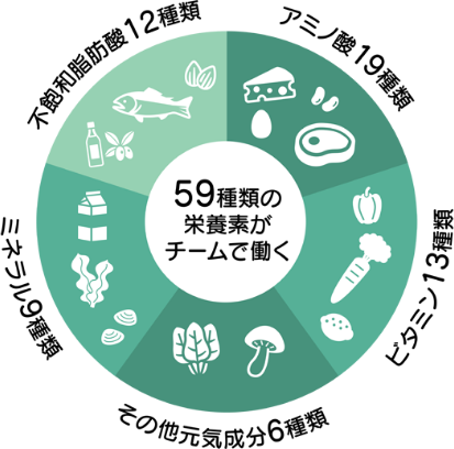 ビタミン13 種、ミネラル 9 種、アミノ酸 19 種、 DHA や EPA などの不飽和脂肪酸 12 種、他にも食物繊維の一種であるパラミロンなど合わせて、全部で 59 種類もの栄養素がバランスよく含まれている微細藻類ユーグレナ。