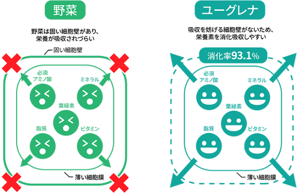 そして、微細藻類ユーグレナは、他の生物にはない希少成分パラミロンを多く含んでいます。それはキノコなどに多く含まれるβ-グルカンの一種。食物繊維であるパラミロンは、健康への応用が期待され、多くの学者や専門家が研究を進めている注目の成分です。