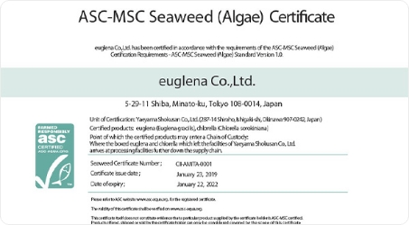 ユーグレナ社で取り扱う石垣島ユーグレナは、「ASC-MSC 海藻(藻類)認証」を世界で初めて取得しました。ASC認証は、環境と社会に配慮した責任ある養殖方法で生産された水産物を対象とする国際認証制度、MSC認証は、持続可能で環境に配慮した漁業で獲られた水産物を対象とする国際認証制度のことです。